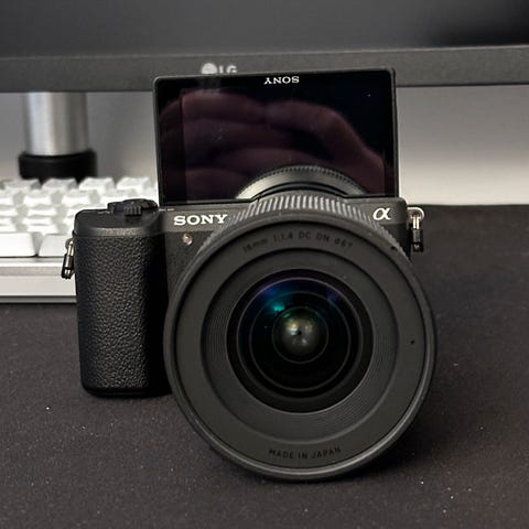 Ble brukt kun en kort periode før det ble lagt bort. Sony Alpha 5100 kompakt systemkamera med utskiftbart 16-50 mm objektiv. Kameraet har innebygd blits og en skjerm som kan vippes opp.