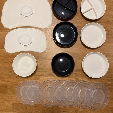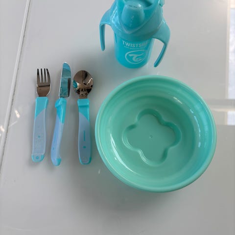 Twistshake matsett bestående av tallerken med lokk,matte, smekke, og bestikk (kniv, gaffel, skje). Farge: rosa og grå. Materiale: plast. Designet for barn.