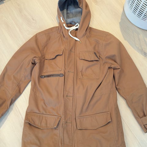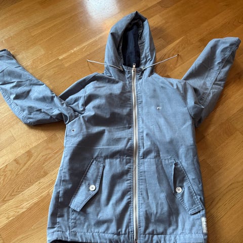 Moods of Norway jakke i størrelse M, fargen grå. Jakken er laget av polyamid materiale og er designet for menn. Den har hette og flere lommer med glidelås. Veldig varm jakke som egner seg for de kalde vinterdagene. Eneste slitasjemerkene er på strammingen på armene, se bildet.