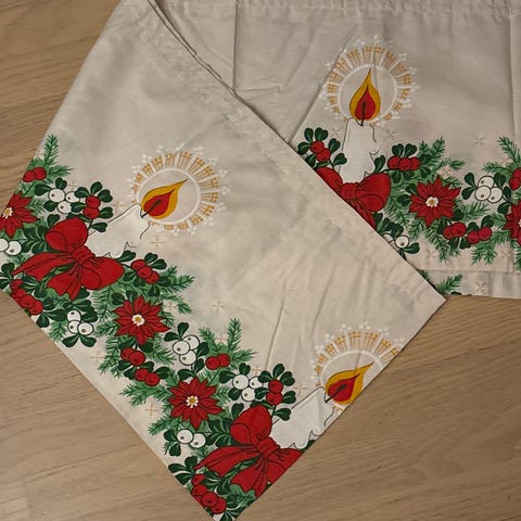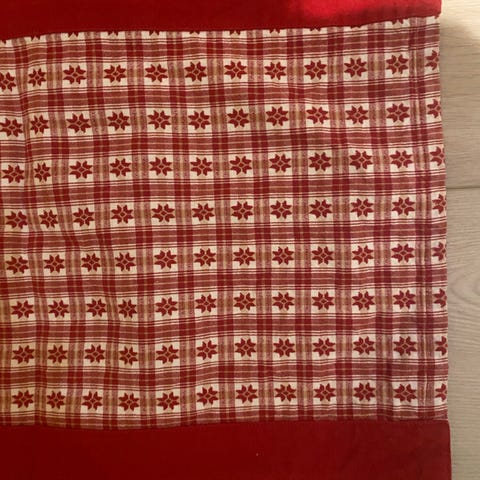 Koselig juleduk (81x85 cm) med påtrykket mønster (stearinlys, julebjeller, julestjerner, etc). Litt kraftig bomullsstoff. Lite brukt. Ingen slitasje eller flekker det jeg kan se.