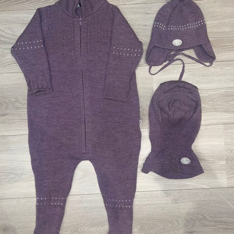 Lillelam ulldress 92/98 og lue i størrelse 48/50 unisex. Laget av 100 % merinoull i grå farge. Passer til barn og gir varme og komfort.