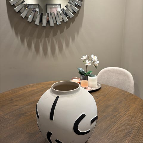 Nydelig keramisk vase i blåtoner med rund form og dekorative detaljer på forsiden. Vasen har en blank finish og en smal åpning på toppen. Se bilder for mål.