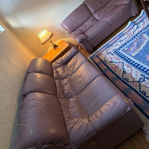 Solid skinnsofa gis bort mot henting. Den er i fin stand, men har noe slitasje og enkelte skader etter at barn hoppet på den. Sofaen har stått mest i kjelleren og vært gjennom en del fester. Den er pent brukt med noen bruksmerker, og består av to deler: én del på ca. 150 cm og den andre på ca. 250 cm. Om du er hendig og kan fikse den, kan den brukes i mange år til.
