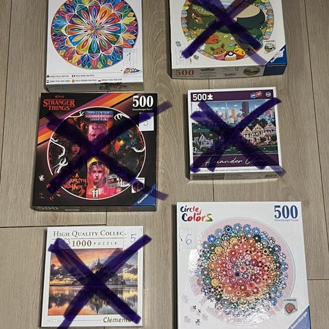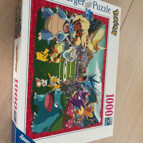 5 puslespill a 1000 brikker , plus ett Ravensburger Pokemon Pikachu puslespill med 727 brikker. Puslespillet er en utfordring, så legger ved printa bilde oppi, som er tatt når det var ferdig , for å se etter "de rette brikkene" på en enklere måte !