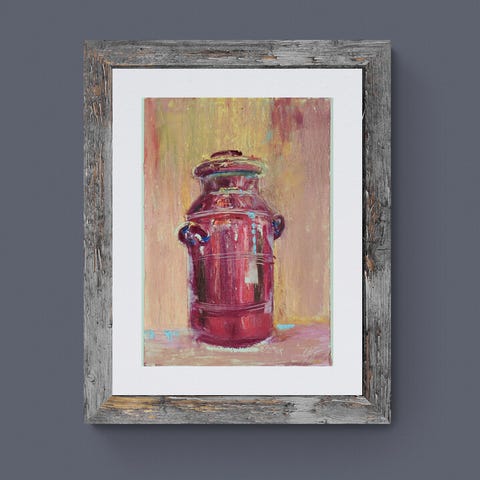 Maleri som viser et vinterlandskap med en hytte omgitt av snødekte trær. Bildet har en ramme med dekorative hjørner i metall. Motivet inkluderer snø på bakken og spor i snøen foran hytta. Fargene er hovedsakelig blå, hvit og brun.