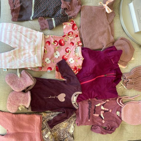Stor klespakke i ull. Inneholder bodyer, bukser, heldress og en strømpebukse. Usikker på om den er bomull eller ull.