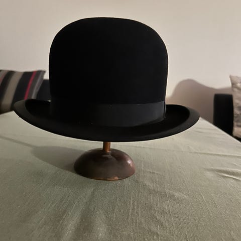 Ubrukt Bowlerhatt i str 60. Kun prøvd på. Håndlaget av hattemakerfirmaet Guerra 1855.