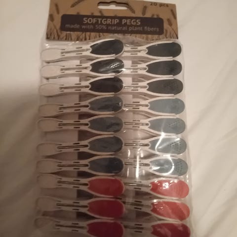 60 eldre klesklyper selges. 56 av dem er laget av tre, 4 er av plast. I tillegg er det en reserve fjør. Noen klesklyper er lite brukt og ser nesten nye ut. Andre er synlig brukt. Selges for 50 kr.