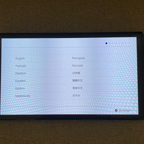 Nintendo Switch oled konsoll med neonrød og neongrønn Joy-Con. Konsollen har en berøringsskjerm og kan brukes både som håndholdt enhet