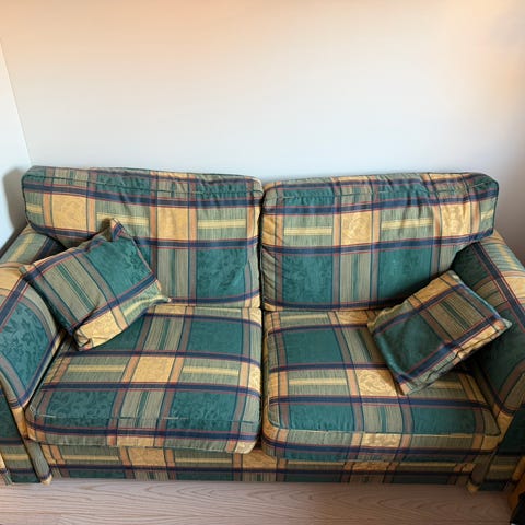 Sovesofa. Med merket på går sikkert Ann å vaske det. Har stått i utleieobjekt. Må hentes så fort som mulig