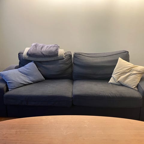 Sovesofa selges da den ikke blir brukt, ryggen kan legges ned så den blir stor nok til at 2 stk kan ligge ved siden av hverandre. Den en mangler noen knotter til å ha under men ellers i fin stand.
