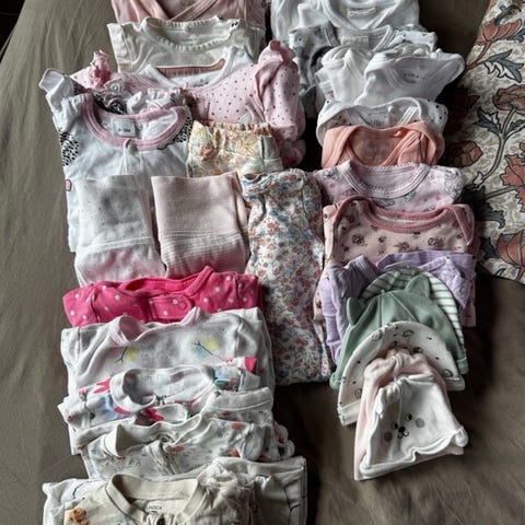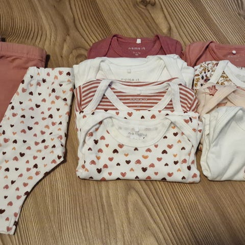 Klespakke med 4 bodyer og 3 bukser. Merker som HM og newbie.