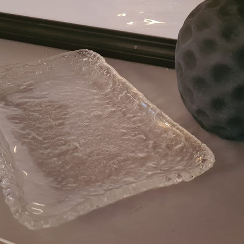 Vakkert, håndlaget glassfat. Fått som reisegave fra Lofoten, men vet ikke noe mer enn det. Forsøkt å ta bilde av signaturen, se siste bilde.