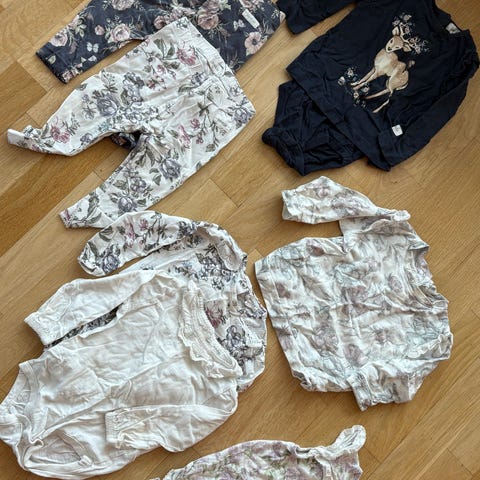 Klespakke inneholder to bukser, en strømpebukse i ull, to t-skjorte bodyer og en langermet body.