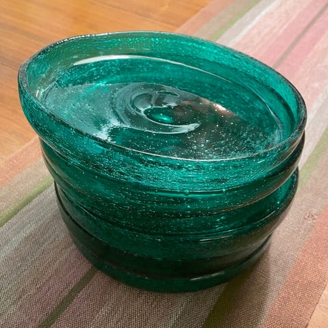 Inkluderer serveringsfat på ca 20cmx5cm , 8 drikkeglass og 1 serveringsskål ca 15cm diameter og 10cm høyde.