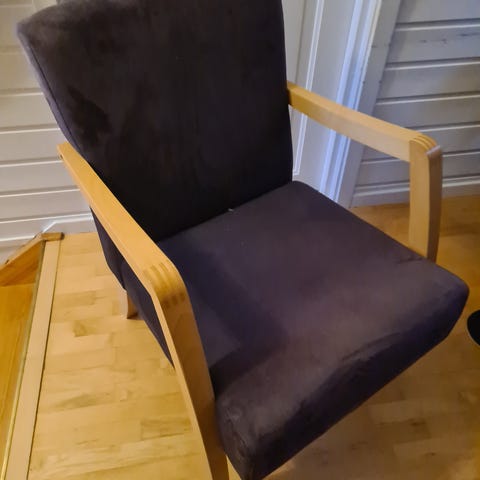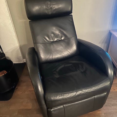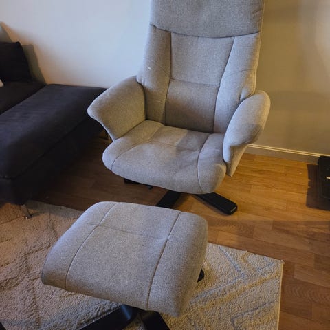 Selger en lenestol med fotskammel. Kan lenes bakover. Veldig god å sitte. En dyp grå farge, som vises nesten svart.