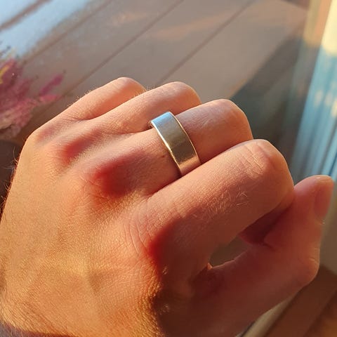 Lite brukt Fitbit Charge 6 i champagnegull og korallfarget reim.