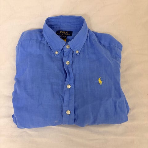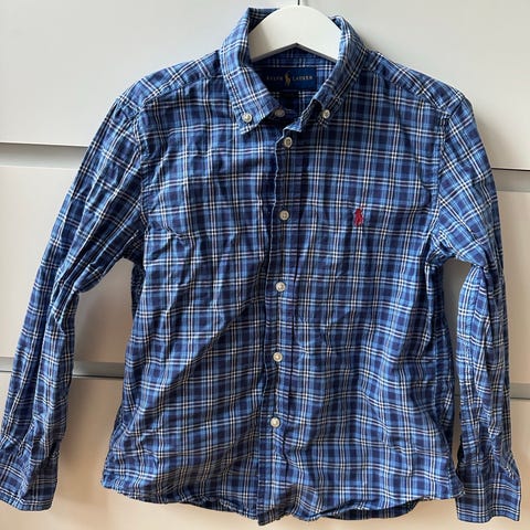 Ralph Lauren 14år, skjorte er litt liten i størrelsen passer kanskje mer for en på 12år. Skjorten er hvit og laget av bomull. (Mangler en knapp øverst og er bittelitt gul under armen, nesten helt usynlig)