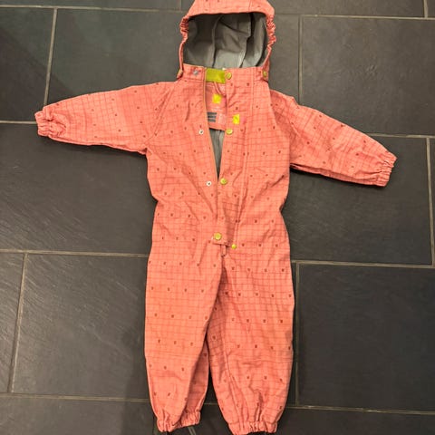 Einaste bruksmerke er to små skrap i mønsteret på knea. Det er ikkje hól i stoffet, men merke etter at barnet har sutte på kne i sandkassen, sjå bilete.
