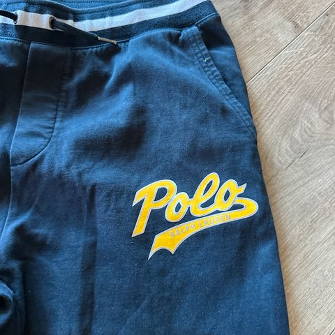 Polo Ralph Lauren gutt joggebukse i størrelse 175 cm, eller herre M. Buksen er blå og laget av bomull. Den har elastisk midje med snøring og elastiske mansjetter ved anklene.