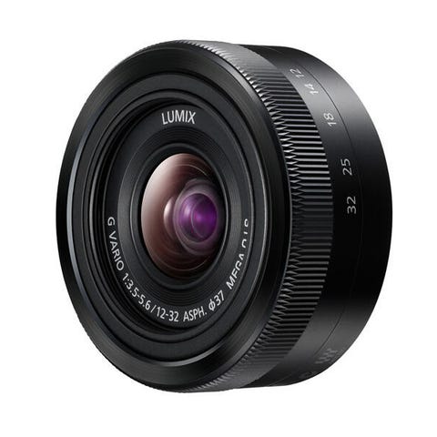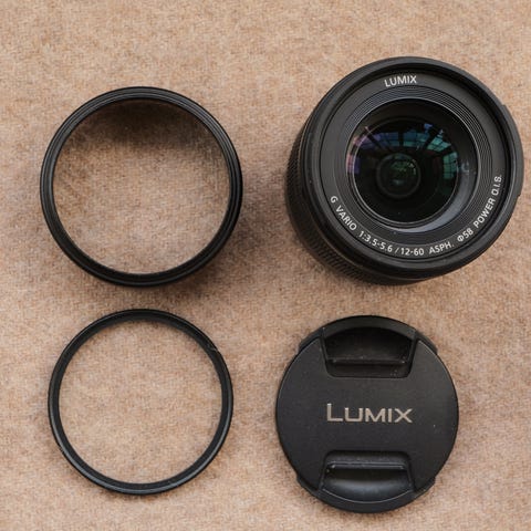 Panasonic Lumix 12-60mm objektiv med zoomfunksjon. Objektivet har en brennvidde på 12-60 mm og en blenderåpning på f/3.5-5.6. Designet for allsidig bruk, egnet for fotografering av landskap, portretter og nærbilder. Objektivet har en svart finish og inkluderer objektivdeksel.