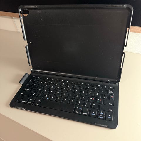 Apple iPad med annen lagringsplass. Produktet inkluderer et deksel med integrert tastatur i svart farge. Dekselet beskytter enheten og gir mulighet for enkel skriving og bruk.