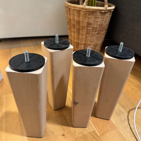 Metallfotstøtter med 20 cm høyde. Helt ok. Har vært på IKEA sultan seng. Vet ikke om de passer på andre modeller.