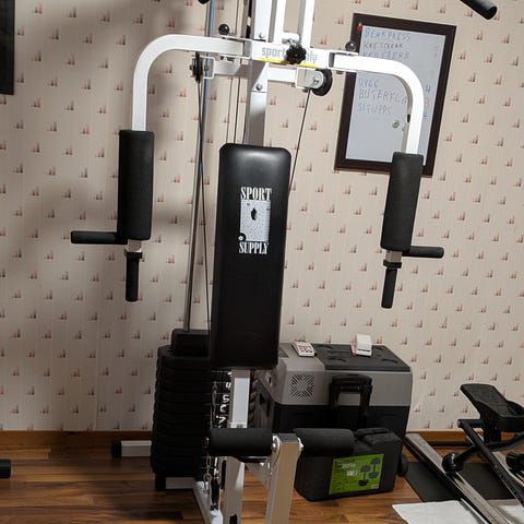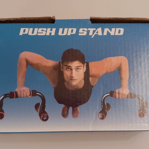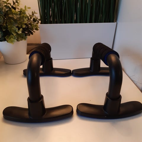 Selger dette treningsutstyret for hjemmebruk. 2 manualer med flere vektplater i ulike størrelser og et push-up stativ. Push-up stativet har mange justeringsmuligheter for å trene ulike muskler i overkroppen. Manualene har : 2 stenger + 4 vekter på 3,4kg hver + 4 vekter på 1,15kg hver + 4 låser.