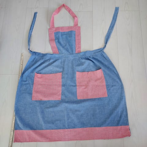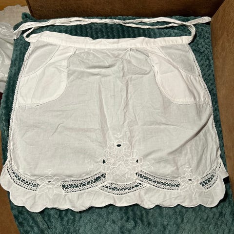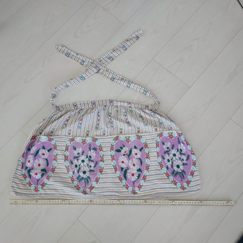 Veldig gammelt forkle med snøring og lomme. Stilige broderte detaljer. Str H 44. B 35 oppe og 57 nede. Hvert bånd måler 65 cm. Som nytt og ingen skader. Sendes mot porto.