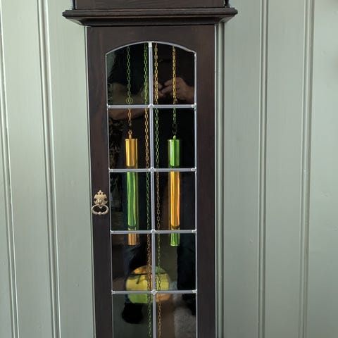 Er av merke Hermle ( kjent tysk merke) med movement 241-053H. Har original kvittering på kjøp av klokka og en service kvittering. Den går men stopper etter noen minutter, trenger en enkel service eller noen som er fingernem.