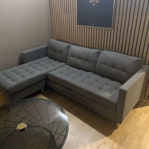 Stor, brukt hjørnesofa. Delene henger sammen bortsett fra den ryggløse delen. Putene henger ikke sammen, men følger med.