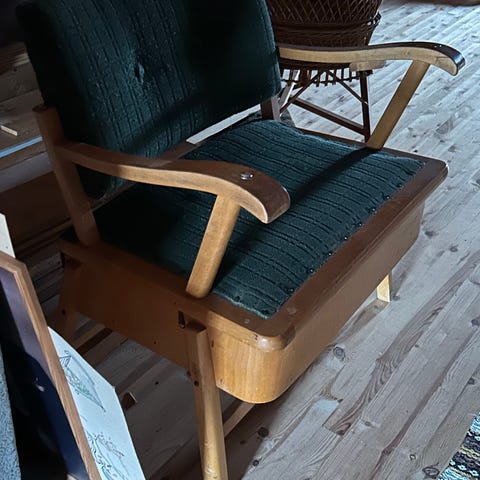 God sittekomfort og stødig konstruksjon. Treverket har noe patina og bruksmerker, og trekket viser normal slitasje for alderen – dette gir stolen et autentisk vintagepreg (se bilder).