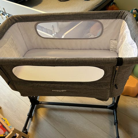 Moweo bedside crib designet for enkel tilgang til barnet. Laget med materialer tilpasset barnemøbler for trygghet og funksjonalitet.