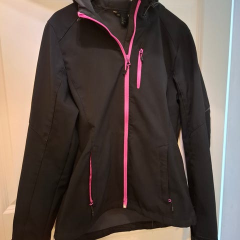 Fin mørkeblå lang softshell jakke med hette i str M.