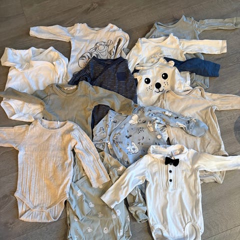 Newbie barneklær for gutt i størrelse 62 med flerfarget design. Inkluderer ulike plagg som bodyer, bukser og gensere i forskjellige farger og mønstre, laget for små barn.