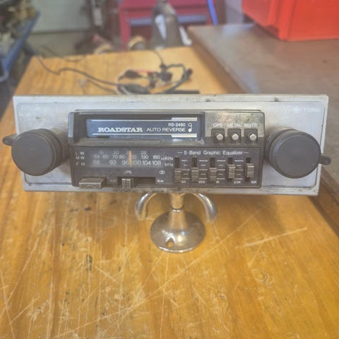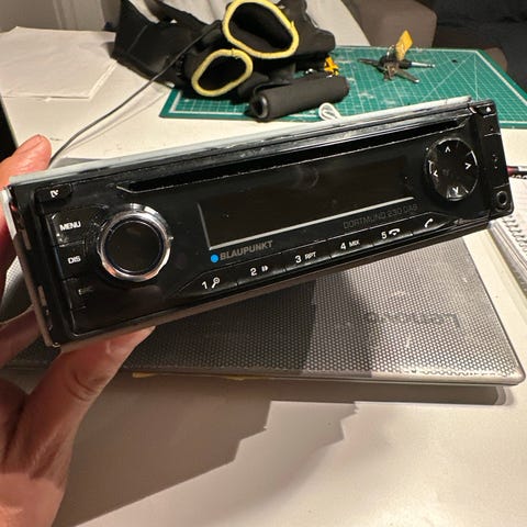 - Blaupunkt Coburg Stereo CR, testet med strøm, ingenting annet. Selve knottene er løse. ser ut til å ha vært limt på på et tidspunkt. kan sikkert fikses av noen som kan sånt. selve knottene ser ut til å gå fint rundt.