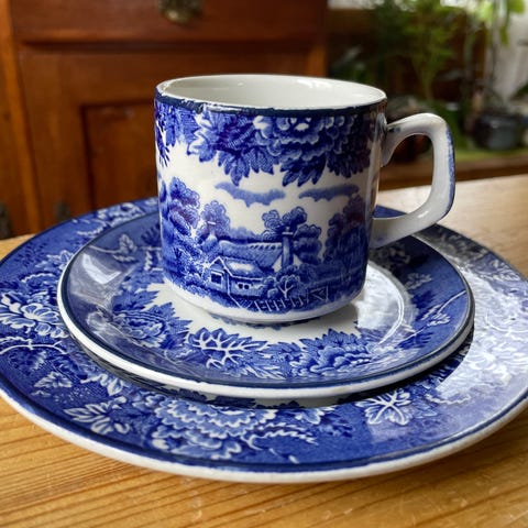 Stavangerflint dekorativt fat med blått og hvitt mønster. Fatet har en firkantet form og er laget av keramikk. Passer til dekorasjon eller servering.