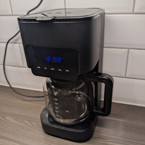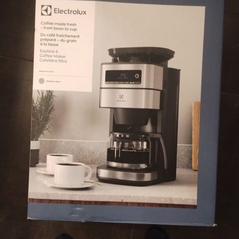 Electrolux kaffetrakter i stål med glasskanne. Utstyrt med digitalt display og vannivåindikator på siden. Kjøpte i desember 2025.