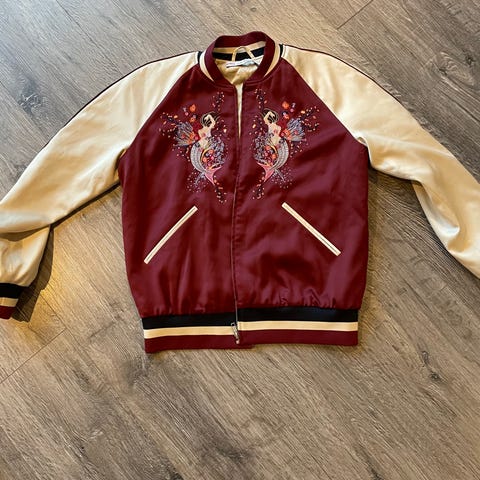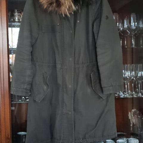 Spesiell mosegrønn jakke med grønt for selges. 3/4 lengde - kortere foran, buer ned bak. Regulerbar bak med reimer. Kan derfor brukes av kvinner med forskjellige kropper. Jakka er i bomull med tett for. Brukt for spesielle anledninger, som feiringer osv. Kjøpt hos Nordlys design. Denne legger man merke til. Kan hentes i Lillehamer eller sendes med Fiks Ferdig.