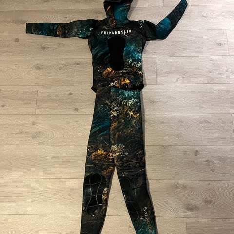 Frivannsliv dykkedrakt 7 mm i str S med kamuflasjemønster, inkludert hansker, sokker, svømmeføtter, 2 maske, snorkel, vektbelte + ekstra vekter og annet tilbehør.