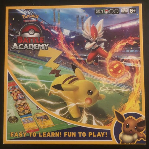 Pokémon Battle Academy brettspill med flere kortstokker og spilleregler. Inneholder spillebrett, kort med forskjellige Pokémon-figurer som Pikachu, Eevee og Infernape, samt instruksjonsbøker. Passer for aldersgruppen 6 år og oppover. Spillet er designet for enkel læring og moro for flere spillere.