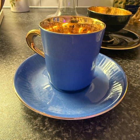 6 Figgjo Flint kaffekopp med skål i svart farge med gull detaljer. Koppene har ulik farge innsiden. Materiale er keramikk. Settet inkluderer flere kopper og skåler.Er som nye