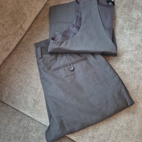 Duffel & Rums dressjakke i brun farge, størrelse 48 for menn. Ytterstoffet består av 72% polyester, 26% viskose og 2% elastan, med fôr i 100% polyester. Jakken har knapper foran og klassisk dressjakke design.