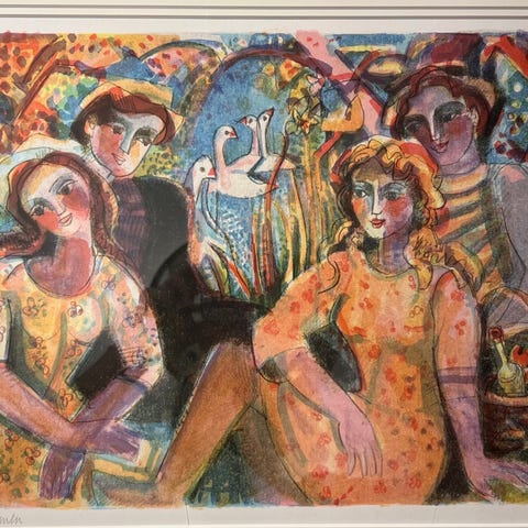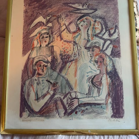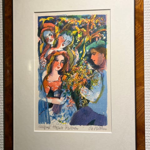 Th. Rittun litografi som viser to kvinner og flere fugler i en fargerik og ekspressiv stil. Bildet er signert av kunstneren Th. Rittun Bildet har en ramme i metall.