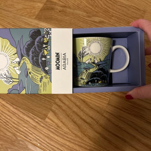 Arabia Moomin kopp med illustrasjon av Mummifigurer. Koppen har en lys lilla og blå fargekombinasjon. Laget av porselen. Passer til daglig bruk som drikkekopp.