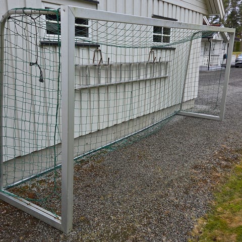 Kvalitets fotballmål som brukes på banene. I god stand. Solid kvalitet. Nye fester laget til bolter i hjørnene.
