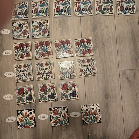 Selger blå, rektangulære fliser. Det ble igjen flere etter prosjekt.