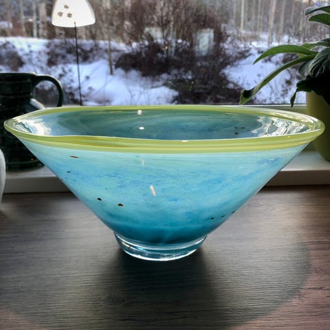 Selger et stykke glasskunst av den svenske designeren Monica Backström for Kosta Boda. Bollen ble produsert i 1992 og er i utmerket stand for sin alder, uten skader eller nag. Denne typen kom i flere ulike størrelser hvorpå dette er den største. Se mål under.