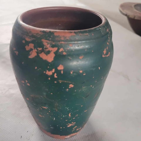 Gi bud ! Den gamle originale leirefatet, med originalglasur jeg ikke har sett lignende i nyere tid. Jeg er over 50 og husker pappa lagde de lekreste grønnsaksrwtter med et lokk av ost og brøddeig over, på vedkomfyren med dette fat. Den kvalitet finnes ikke lenger, denne inneholder mange, fine historier fra en glad tid❤️🥰😍