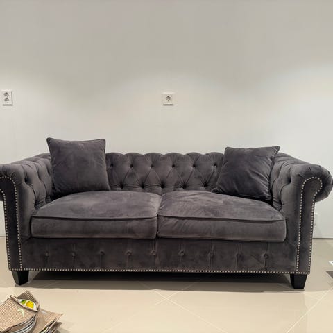 Veldig pent brukt sofa i grå velur stoff. Har selv kun hatt denne i 1 år. Den er super fin, og selges grunnet flytting. Plass til opptil fire personer. Moderne chesterfield design.